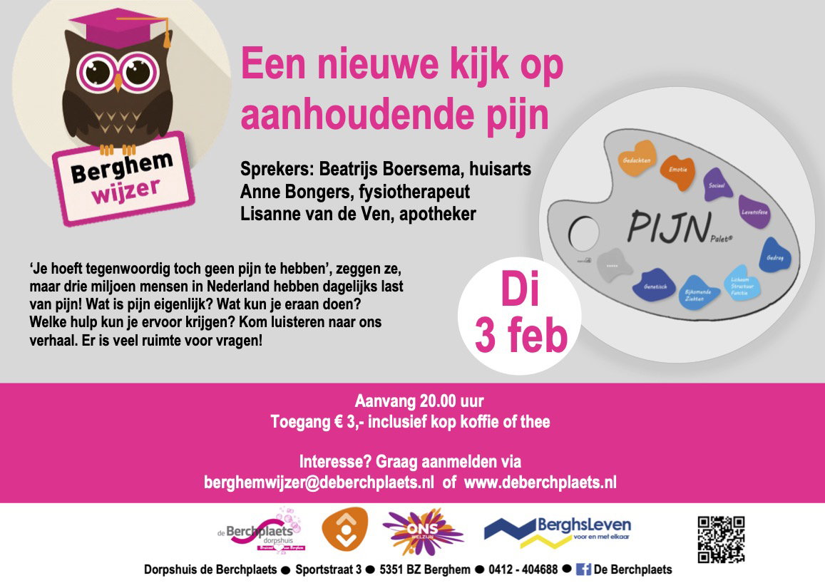 Soms wordt er gezegd ‘je hoeft tegenwoordig toch geen pijn te hebben’, maar 1 op de 5 mensen in Nederland heeft dagelijks last van pijn. Wat is pijn eigenlijk, hoe zit dat in je lichaam en in je hoofd? Wat kun je eraan doen? Welke hulp kun je ervoor krijgen? Wil je hier meer over weten en misschien ook andere mensen ontmoeten die hier mee te maken hebben, kom dan luisteren naar ons verhaal. Er is veel ruimte voor vragen!